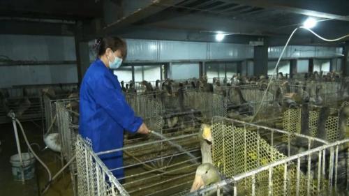 在霍邱縣花園鎮安業村的安徽牧康鵝業有限公司,員工劉雪梅正在進行朗德鵝喂養及養殖車間清掃工作。