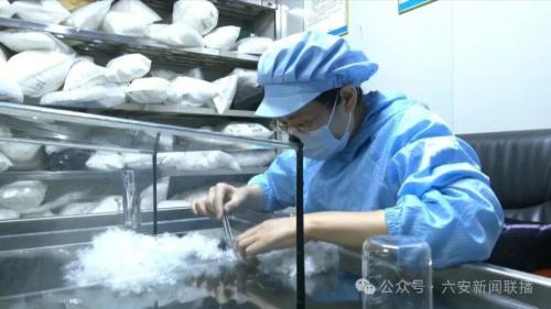 走進安徽博隆羽絨科技有限公司,生產車間內自動化場景隨處可見,潔凈的羽絨在自動化管道中流動,經過多道精細分揀與水洗工藝,變得蓬松柔軟、潔凈如云,為后續高品質制品加工奠定基礎;分揀區域里,工人根據絨朵大小、蓬松度等指標,對羽絨進行精準分類。